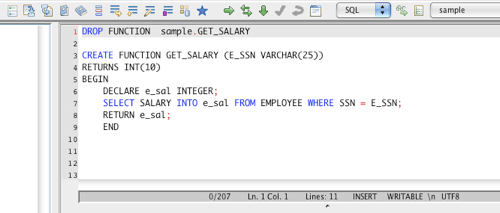 The procedure editor retrieves the contents of the function from the database, and then generates the drop and create statements for the function. The editor provides function lookup, and auto table and column lookup. Shown below is an example image for a MySQL function.