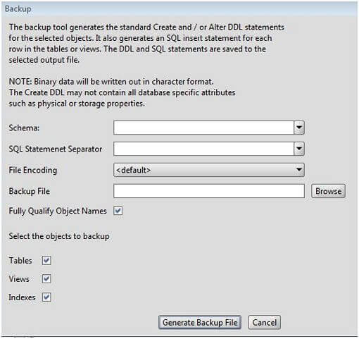 The HSQLDB database backup tool works by generating all data definition language (DDL) statements for the HSQLDB database objects selected by the user. It also generates SQL insert statements for all table data in the schema. The DDL and SQL insert statements are written out to a backup file.