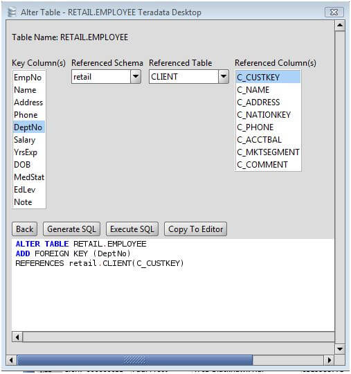 Below is a screen shot of the add foreign key function of the Teradata alter table tool.